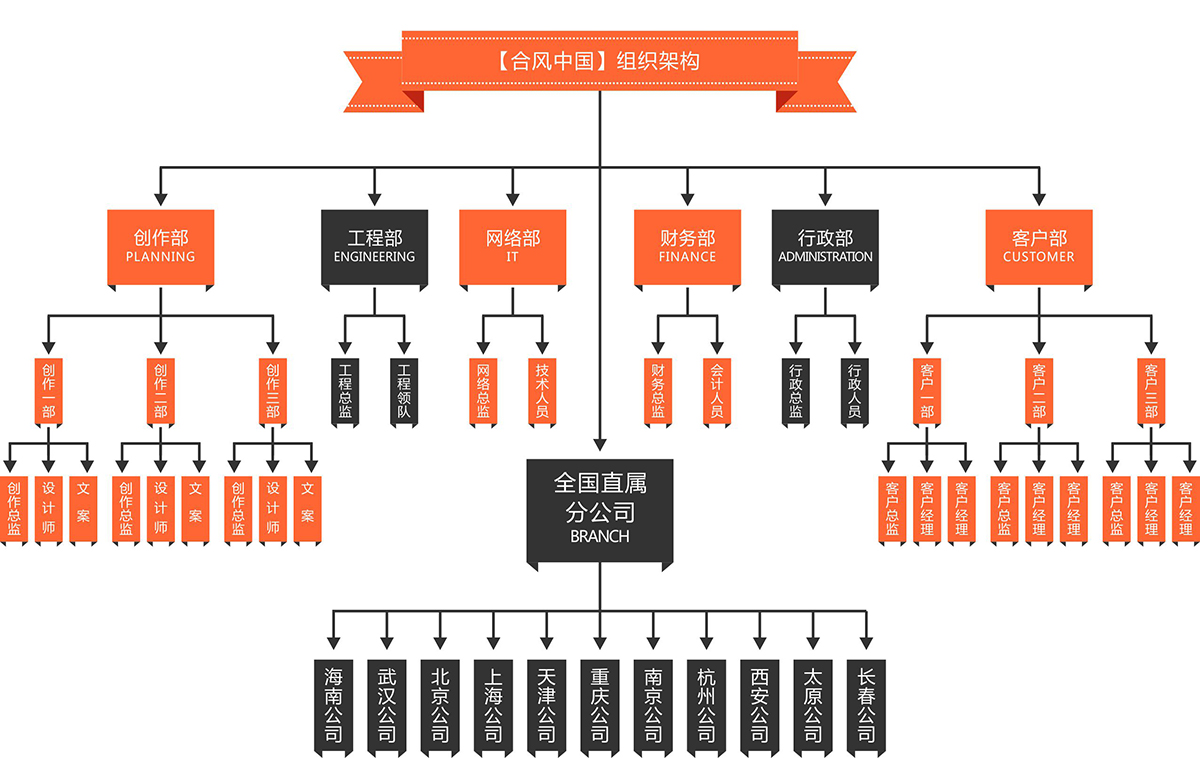 構(gòu)建完善的運(yùn)營體系和管理組織系統(tǒng),并在全國各地直屬公司相互配合項(xiàng)目及人才等資源。客戶部(國際化思維,本土化溝通)、創(chuàng)作部(創(chuàng)意領(lǐng)先,向左,你就是第一)、工程部(精雕細(xì)琢,成就唯一)、財務(wù)部(高起點(diǎn),成就堅(jiān)實(shí)后盾)、行政部(高效,快速反應(yīng))。創(chuàng)意決定實(shí)力,我們吸收廣告界的創(chuàng)意人才,我們有足夠的自信心,所以我們把分公司開到了全國。有人才、有視野、有歷練,自然就有實(shí)力。