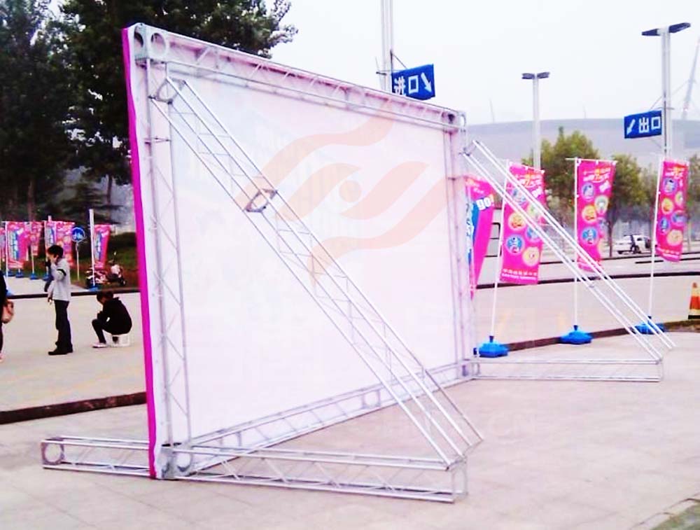 廣州合風(fēng)演出設(shè)備租賃公司倉庫有大批量的桁架、背景架租賃,專門用于搭建背景拉噴繪等其它制作方法,用于演出慶典活動現(xiàn)場的廣告看板、簽到處、簽名墻、拍照背景等作用,有專業(yè)的工程人員負責(zé)安裝及站立。