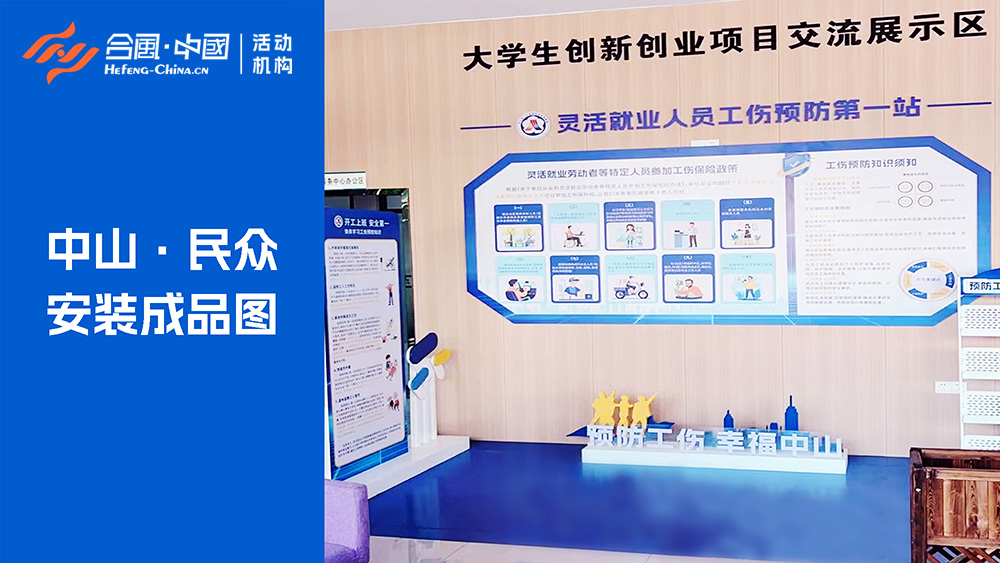 「合風(fēng)中國(guó)」廣東省廣州市中山市特裝設(shè)計(jì)制作安裝慶典活動(dòng)策劃禮儀演出公司4A執(zhí)行服務(wù)公關(guān)傳媒廣告案例,中山市靈活就業(yè)人員工傷預(yù)防第一站,主題為“預(yù)防工傷·幸福中山”,全程由「合風(fēng)中國(guó)」中山活動(dòng)策劃公司設(shè)計(jì)制作安裝完成,中山市本次廣告裝潢特裝設(shè)計(jì)制作分四個(gè)站,分別是三鄉(xiāng)、南朗、民眾、古鎮(zhèn)。設(shè)計(jì)制作布置的內(nèi)容分三大板塊,分別有“靈活就業(yè)勞動(dòng)者等特定人員參加工傷保險(xiǎn)政策、工傷預(yù)防知識(shí)須知、開(kāi)工上班安全第一快來(lái)學(xué)習(xí)工傷預(yù)防知識(shí)”。